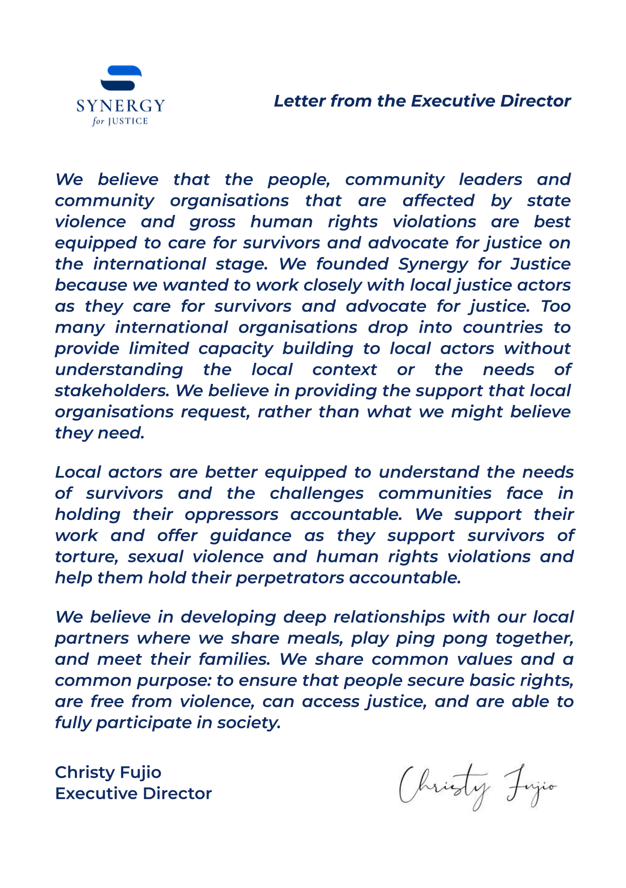Synergy does not aim to grow simply for the sake of growth; we carefully consider where we can add value by bolstering the efforts of people and communities on the ground to enhance justice and accountability and to support survivors of human rights violations.