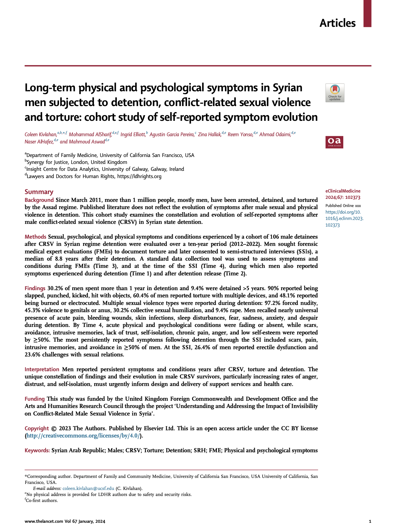The study, Long-term physical and psychological symptoms in Syrian men subjected to detention, conflict-related sexual violence (CRSV), and torture: cohort study of self-reported symptom evolution, was published in eClinical Medicine, a Lancet journal. Researchers from Synergy for Justice, Lawyers and Doctors for Human Rights, and the University of Galway examined the self-reported symptoms experienced after male CRSV in Syrian state detention over a ten-year period (2011-2021).