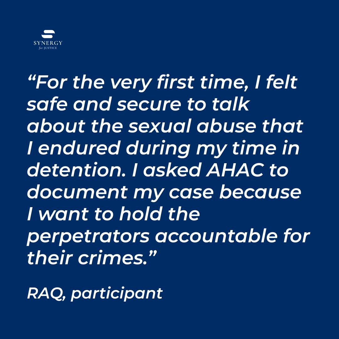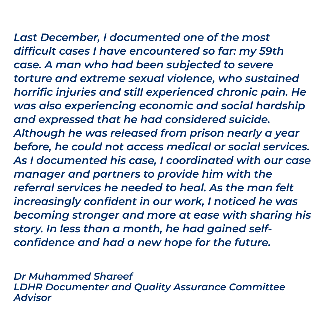 For many survivors, the healing and recovery process begins with disclosing their experience and choosing to have it documented by a medical professional for submission to international justice actors or as part of an asylum-seeking application. The process of disclosing their traumatic experience creates an opportunity for doctors to connect them with additional medical and mental health care providers and social services agencies.
